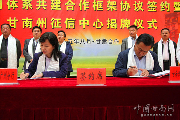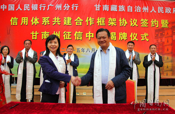 中国甘肃网8月20日讯 据中国甘南网报道 (记者 王朝霞) 为加快推进甘南州社会信用体系建设,为全州经济金融发展创建良好的金融生态和社会信用环境,在人民银行广州分行的大力支持下,甘南州政府成立了州征信中心。8月20日上午,人行广州分行与甘南州政府信用体系共建合作框架协议签约暨甘南州征信中心揭牌仪式在合作举行。