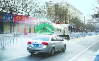 一辆洒水车在道路上进行洒水作业。近日,随着天气转暖,兰州市洒水车转入夏季作业模式,增加洒水频率,保持路面净化。记者 盛学卿