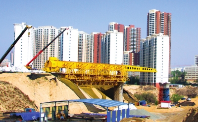 昨日,由中铁二十一局集团公司购进的首台移动模架造桥机在承建的宝兰客运专线兰州枢纽五星坪特大桥工程工地开动。据悉,该移动模架造桥机原位一次浇筑成型,完工后向前移动模架进行下一孔作业,从而节约大量的资源和时间。(记者 滕效宏 通讯员 杨戈摄)