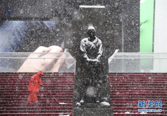 3月21日,工人在美国纽约时报广场清扫积雪。美国纽约21日再次遭遇暴风雪天气,纽约三大机场取消了超过2000个航班,全市公立学校停课。 新华社记者 王迎 摄