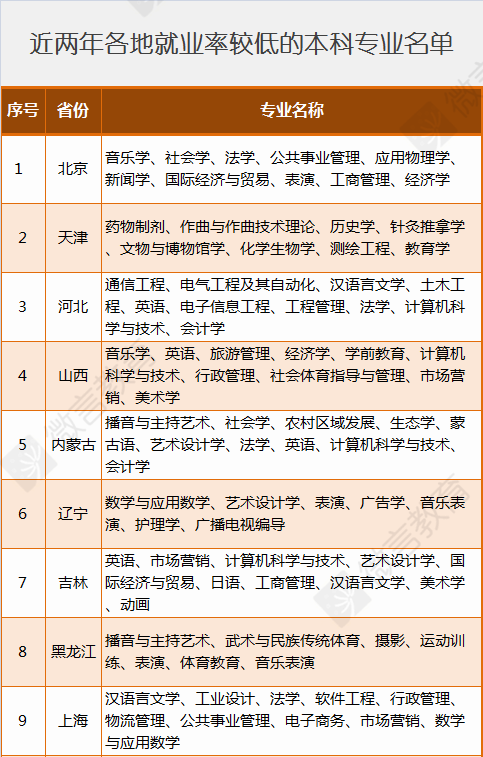 为了加强对高校专业设置的宏观管理,引导高校主动调整学科专业结构,教育部高等教育司整理并公布了近两年(2012、2013年)全国和分省的就业率较低的本科专业名单。