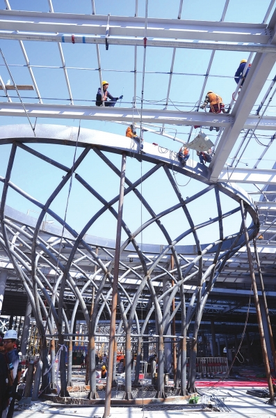 李金胜说,兰州中川枢纽工程三大建筑之一的换乘中心于7月31号主体结构封顶,现正在安装钢结构及机电等;P1停车楼于8月17日主体结构封顶,现正在安装设备及砌筑设备用房等;P2停车楼8月28日主体结构封顶。目前,枢纽工程换乘中心、停车楼主体结构已全部完成,进入到装饰装修、机电设备安装阶段,全部按计划有条不紊推进,保证与铁路同步投入运行。
