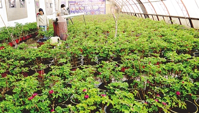 经过多年研究培育,临夏州河州牡丹培育有限公司培育的6个反季节牡丹品种、1300盆含苞欲放的各色牡丹春节前将投放市场。图为河州牡丹培育有限公司大棚内即将投放市场的牡丹。(记者 王为民 摄)