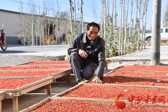 10月27日,酒泉瓜州县古城村村民陈显才晾晒最后一茬枸杞。他家40亩地枸杞今年收入23万元。2015年双塔乡枸杞面积达到14500亩枸,全乡农民人均纯收入可达到6956元,群众来自枸杞产业的人均纯收入可达到1360元,占农民人均纯收入的19.5%。