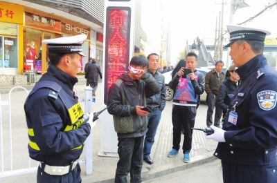 交警对乱穿马路的行人开出罚单