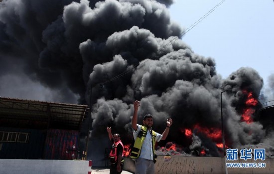 7月29日,在加沙城,巴勒斯坦消防员在起火的发电站储油仓库前工作。当日,以色列坦克击中加沙唯一发电站的储油仓库,导致加沙城及其他巴勒斯坦控制地区大面积断电,约180万人受到影响。 新华社发(纳萨尔摄)