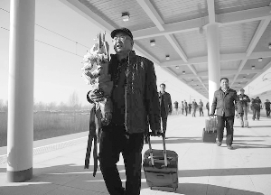 第一位购D2703次动车票的王东伟手捧鲜花进站。特派记者 房毅 摄