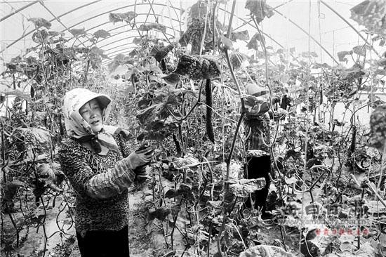 华亭县东华镇黎明川现代农业示范园内菜农正在采摘黄瓜。今年,华亭县大力发展蔬菜产业,新建改建连栋蔬菜拱棚24座、大棚1200座,带动全县种植蔬菜10万亩。通讯员 张小兵