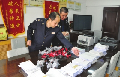 中国甘肃网3月16日讯 据兰州日报报道 (特约记者 李静 张曦元 摄)近日,市地税局联合市公安局统一行动,破获一起以印章为主的特大制贩假发票团伙案,累计涉案金额7000万元以上。据了解,此次税警联合,在城关区西关十字一居民楼出租屋内当场抓获两名嫌疑人,查获地税税收印章150余枚、地税空白发票3900余份、以及制假发票的笔记本电脑、打印机、刻章机等物品。目前,此案件仍在进一步侦查中。