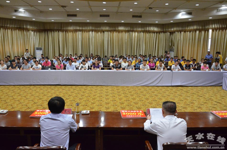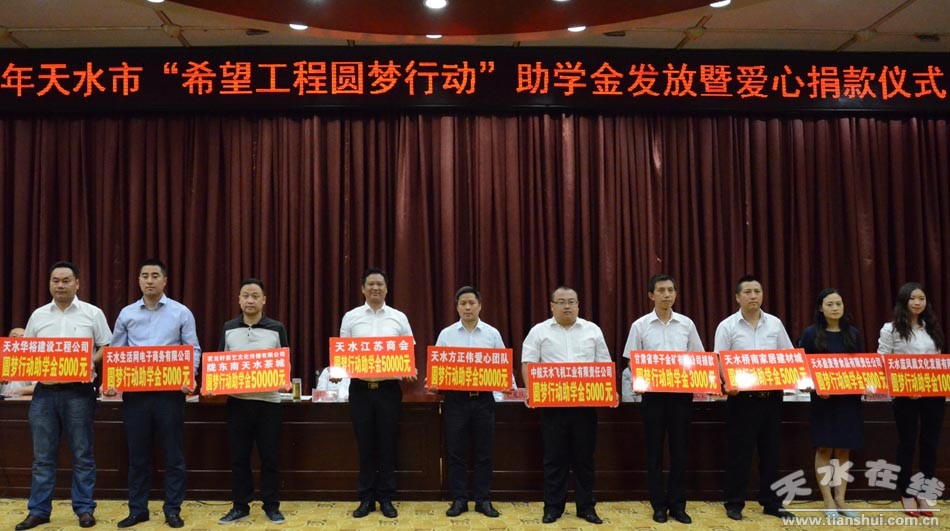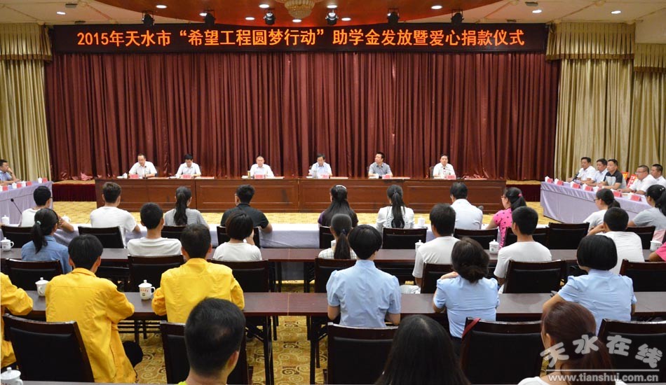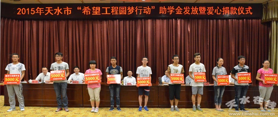 8月26日,2015年天水市“希望工程圆梦行动”助学金发放暨爱心捐款仪式在天水迎宾馆举行,天水市85名贫困大学新生每人获得5000元助学金,共计42.5万元。