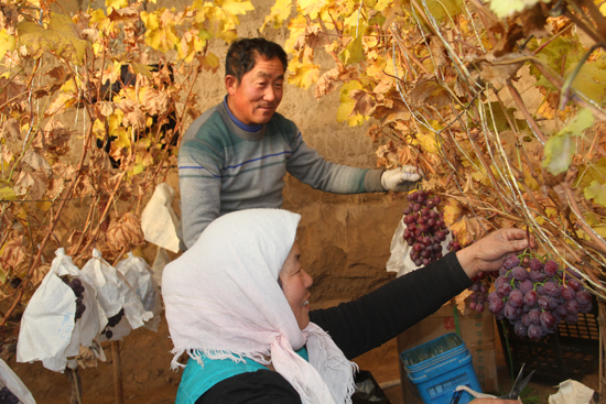 近日,山丹县位奇镇种植的反季节葡萄在2015年元旦到来之际即将成熟上市,葡萄采摘园里一派丰收的景象。(胡秉珍 何天新摄)