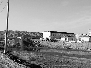 部分被填埋的鱼塘不远处就是规划中的新农村。