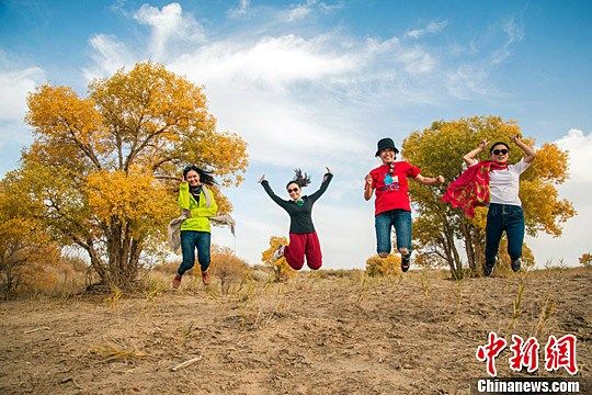 图为游客在敦煌西湖胡杨林里合影留念。王斌银 摄