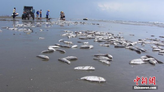 7月9日凌晨,大量死鱼出现在广西防城港市白浪滩景区滨海沙滩上,死鱼群约2-3米宽,从东到西绵延约2公里。死鱼均为同一品种鱼类,部分鱼身残缺破损,景区初步怀疑系迁徙鱼群遭到电击或爆炸袭击。目前,当地环保、海洋、水产畜牧等相关部门已介入调查。图为工作人员清理死鱼。罗天成 摄