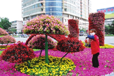 绿化人员正在摆放鲜花