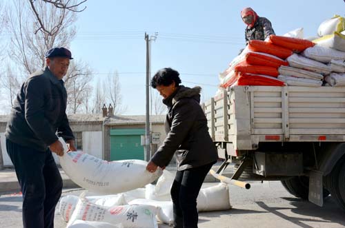 图为肃州区果园乡的农户正在购买化肥。 记者 何佳 刘蓉摄