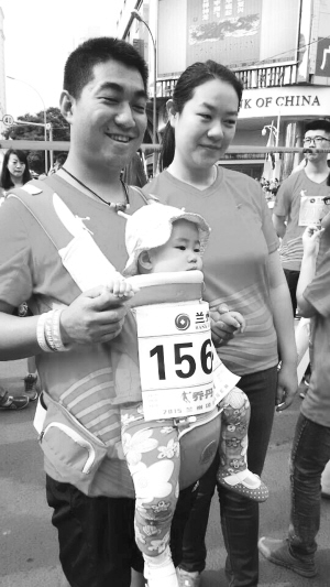 中国甘肃网6月14日讯 据西部商报报道(记者 马霞文)父亲刘忠泽、母亲刘晋带着他们刚刚8个月大的宝宝一起来参加马拉松。孩子在婴儿背袋里高兴地笑着,胸前还挂着爸爸的号码牌。